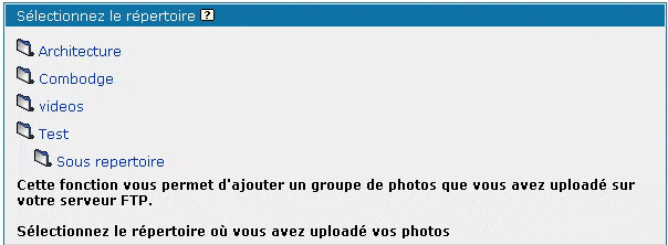 C'est la raison pour laquelle vous devrez réfléchir à l'avance de la structure de fichiers et de répertoires pour vos téléchargements FTP. Ils doivent aller dans le répertoire albums, et il est recommandé d'y créer une structure claire de répertoires et de sous répertoires.